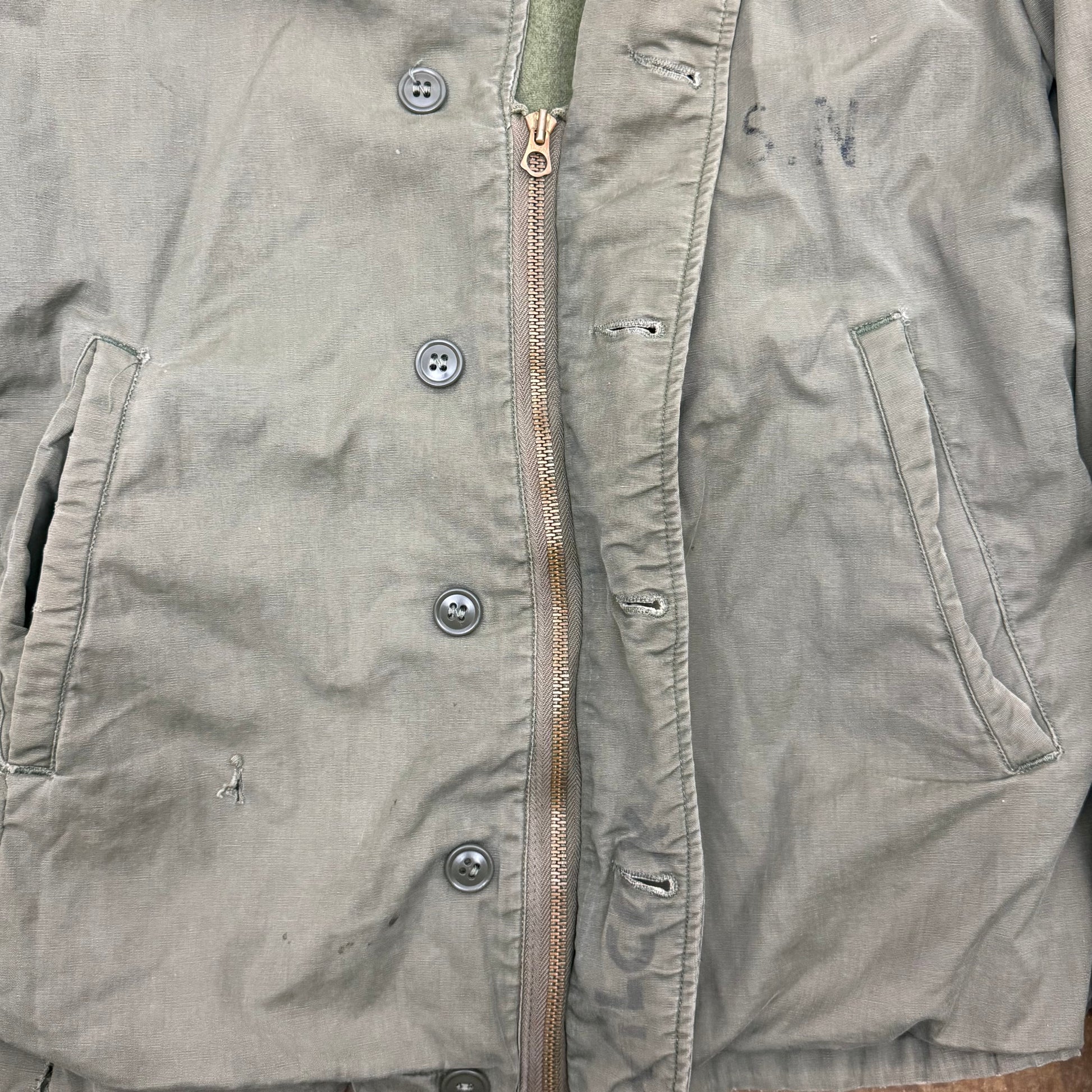 Featuring Talon zipper and all buttons present, this wool lined jacket was used by US Naval personnel as a lighter alternative to the N-1 deck jacket.